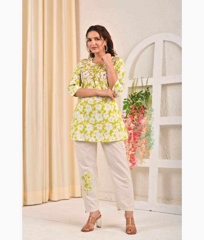 Add a touch of earthy elegance to your wardrobe with this stylish patchwork cotton green co-ord set, perfect for the modern woman who loves comfort with character. Crafted from soft, breathable cotton, this set features a beautifully stitched silhouette that drapes effortlessly, making it ideal for day-to-night wear. The top showcases intricate patchwork detailing in complementary tones, adding depth and a handcrafted charm to the overall design.