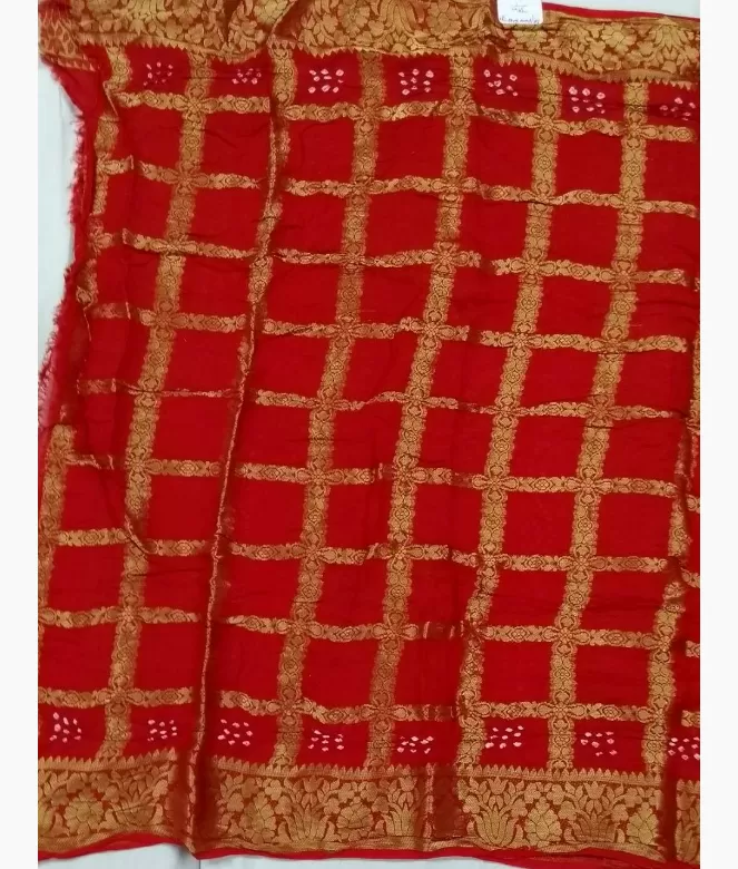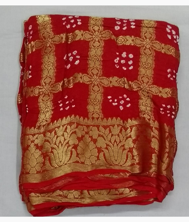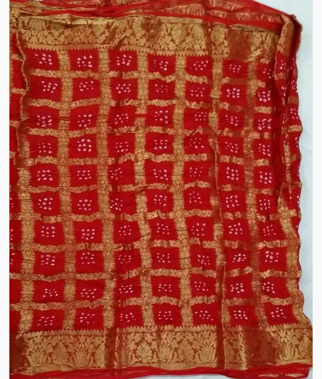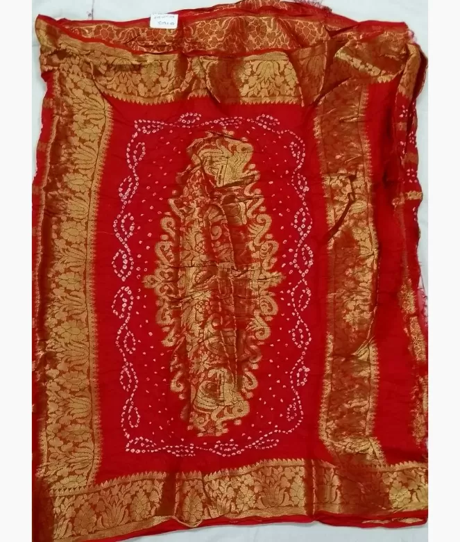 Heavy pallu of zari elephant design with bhandhej. Border is of leaf flower design with golden colour zari on saree. Matching work of saree border is on blouse patti for neck and sleeves.