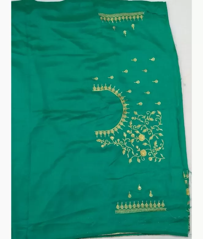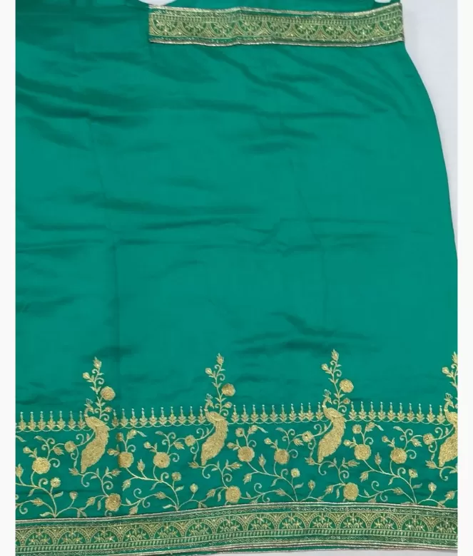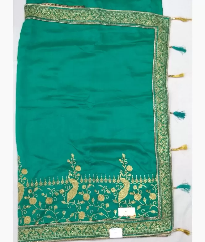 Beautiful Peacock design thread and jari with sequence work on all over saree. Fine jari and sequence work on border pallu with latkan on saree makes it beautiful. Matching work of saree is on blouse for neck and sleeves.
