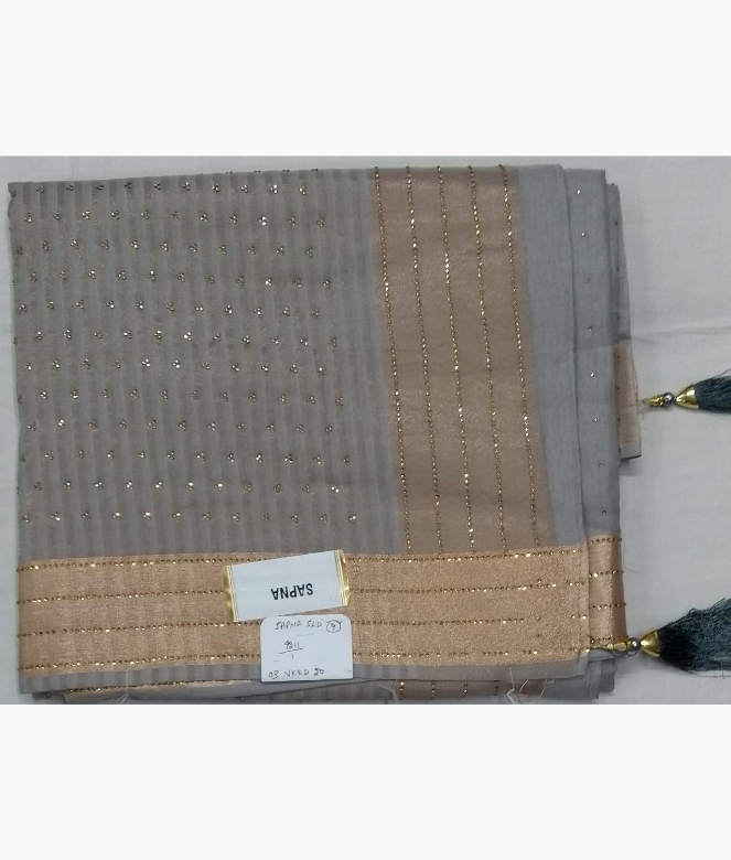 Border design is of golden colour jari with sequence work on all over saree. Fine jari and saros ki work with stripe design on pallu. Matching work of saree pallu is on blouse with border patti for neck and sleeves.
