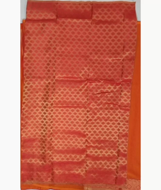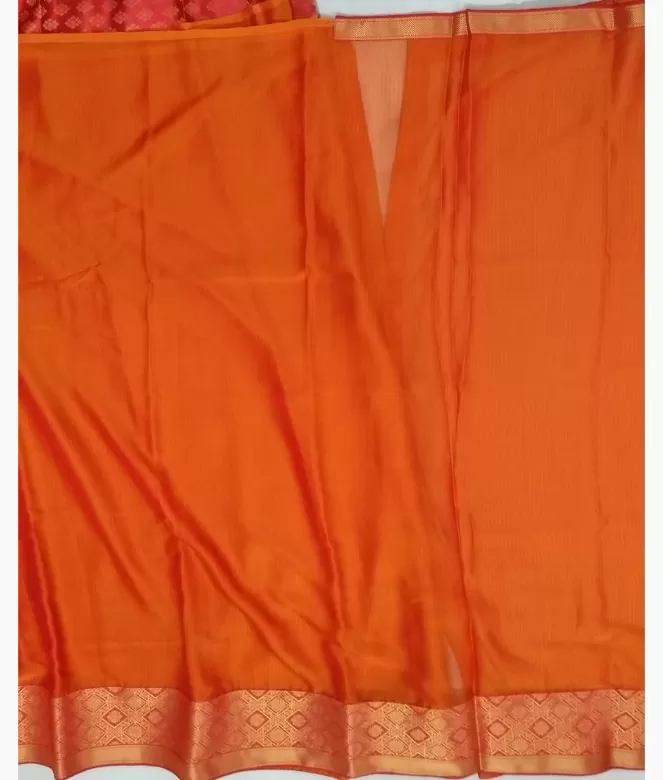 Border is of golden colour zari patti with two design pattern shows fine quality of work. Blouse is of matching same pallu border of saree of brocket fabric for back, neck and sleeves.