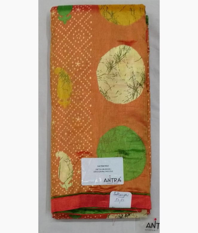 All over circle and leaf design printed silk saree. Circle, leaf and bhandhej print design on all over saree in multi colours.
