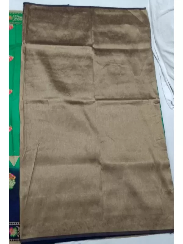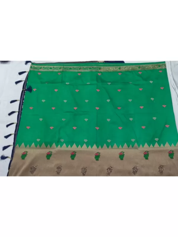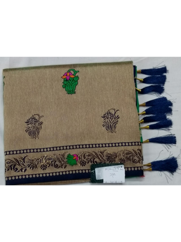 Heavy pallu of Zari with latkan. Border is of leaf design with sequence work. Blouse is of shimmer fabric with matching same border of saree.