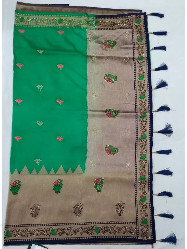 All over multi colour thread weaving booty on saree. Sequence work outline on weaving booty. Heavy pallu of Zari with latkan. Border is of leaf design with sequence work. Blouse is of shimmer fabric with matching same border of saree.