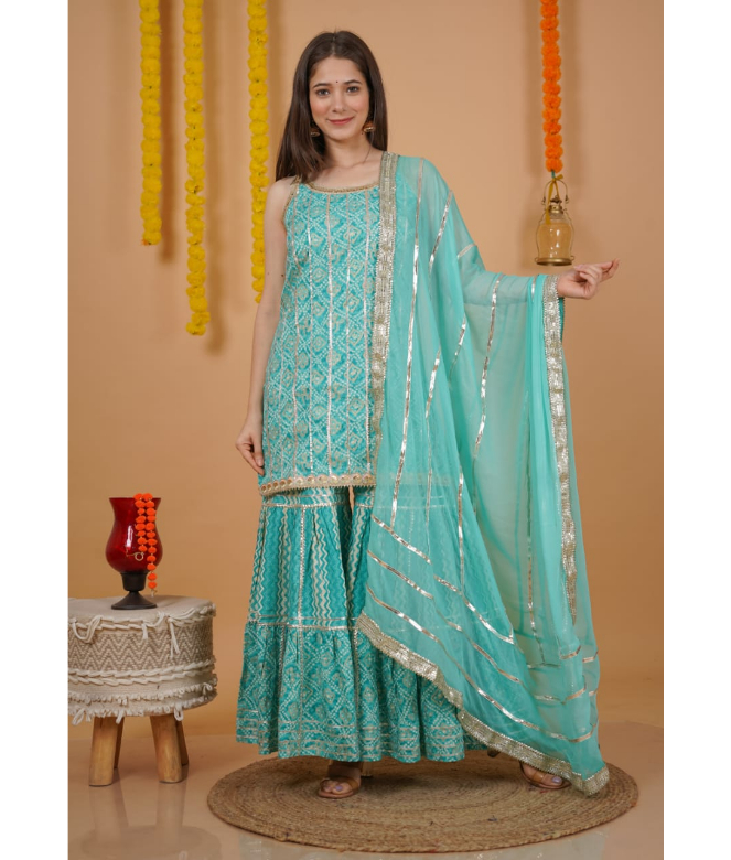 Our collection is all set to enter your wardrobe with our sharara suit.