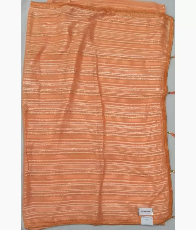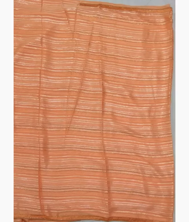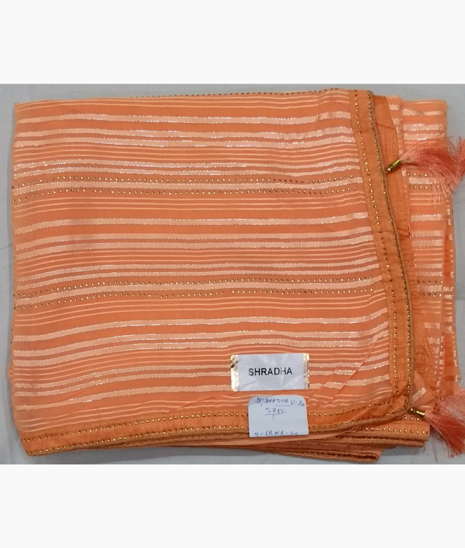 Sequence work outline on strips on all over saree. Saree with latkan on pallu. Border is of sequence work with piping. blouse is of row silk fabric with matching same border of saree.