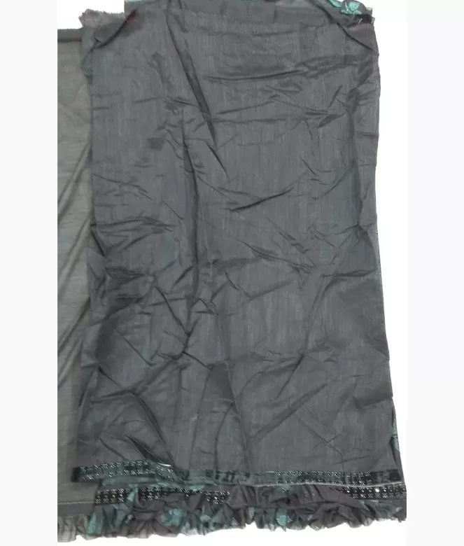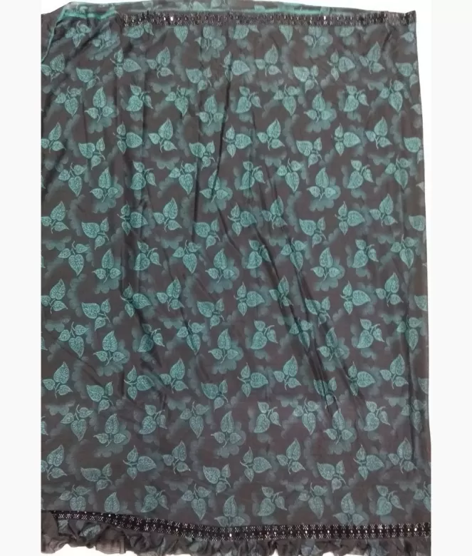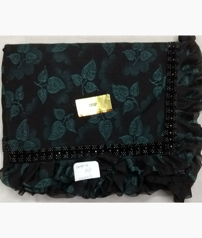 All over leaf design photogenic printing jaal on saree. Border is of velvet black colour patti with mirror work and sequence work on saree with frill design on all over saree.
