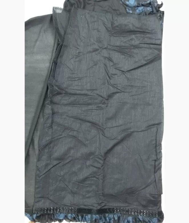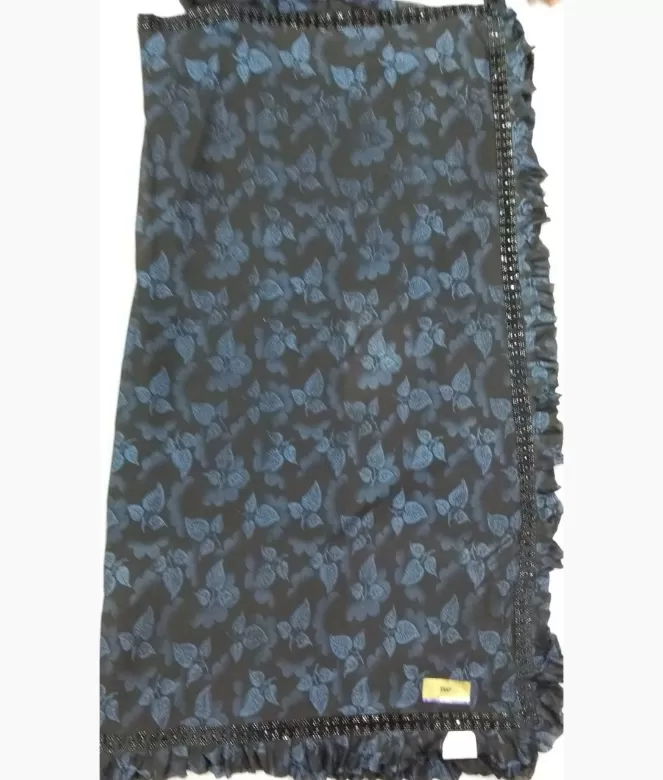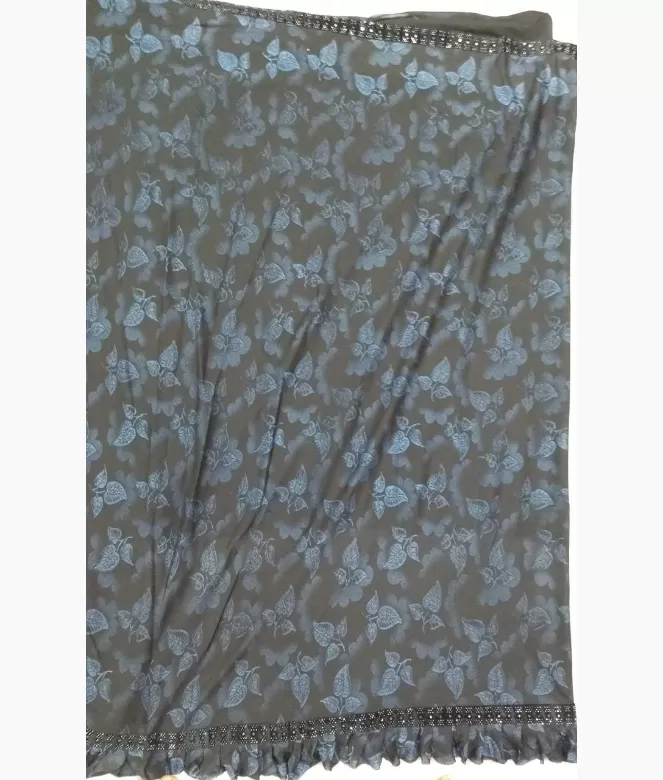 All over leaf design photogenic printing jaal on saree. Border is of velvet black colour patti with mirror work and sequence work on saree with frill design on all over saree.