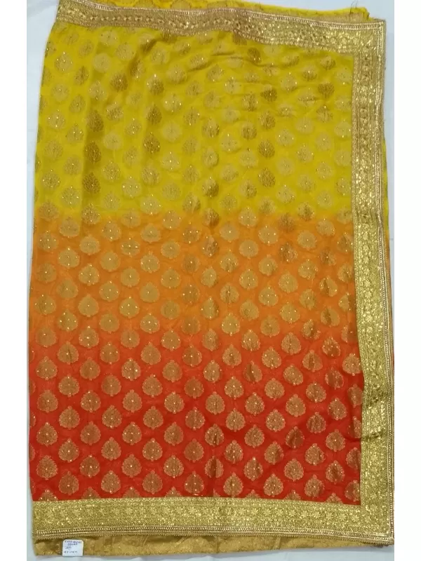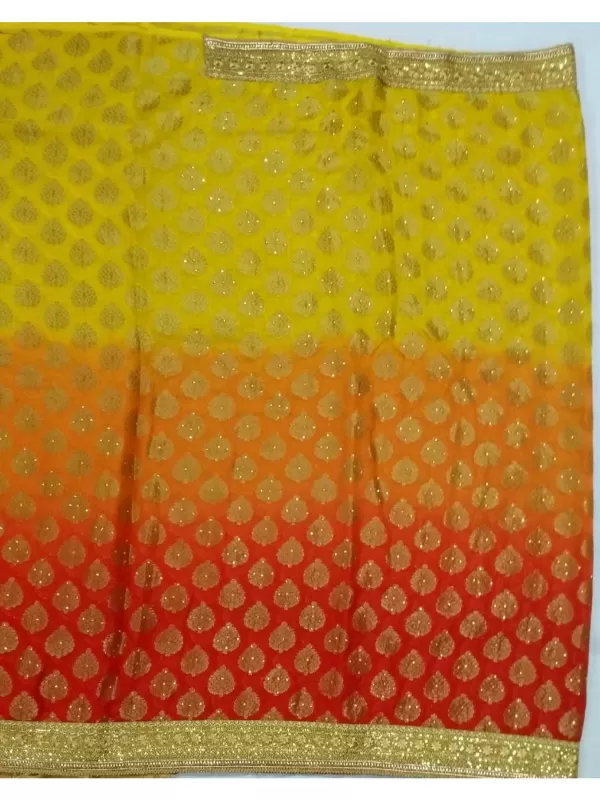 Shaded yellow, orange and red colour on shoulder of saree. Border design is of Zari and sequence work on saree blouse is of shimmer fabric with matching same border patti of saree for neck and sleeves.