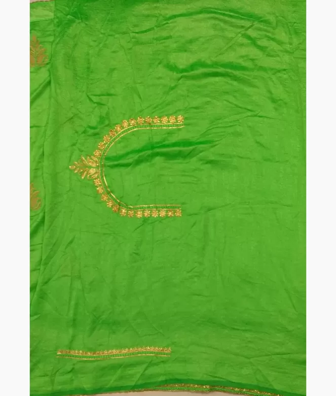 Double border design of golden colour flower jaal design in zari work on saree with sequence work. Matching work of saree border is on blouse for neck and sleeves.