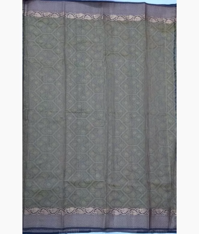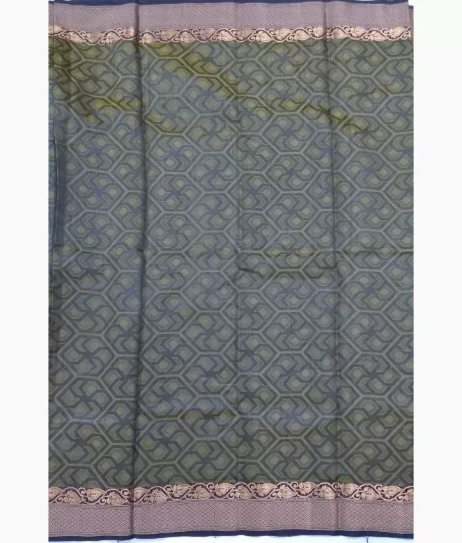 Border is of leaf design in golden colour zari work with light golden colour rhombus design jaal heavy double design border on saree. Blouse is of emboss strips jaal with matching same work of saree with same border patti for back, neck and sleeves.