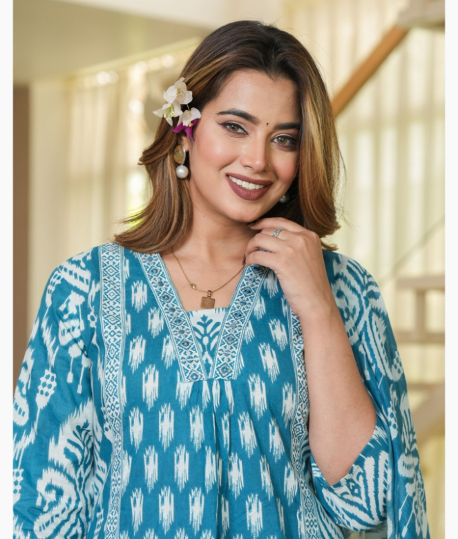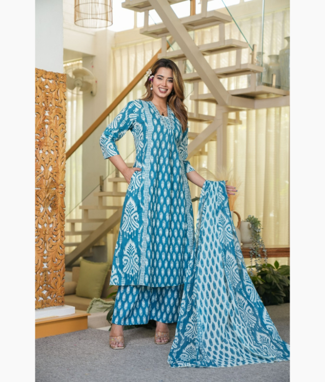 Elevate your ethnic wardrobe with this beautifully stitched A-line cotton blue suit set, a timeless ensemble that blends comfort with refined charm. Crafted from premium quality cotton, the kurta features an A-line silhouette that flatters every body type, offering a graceful flow with every step. Intricate thread work and subtle detailing around the neckline and sleeves add a touch of sophistication without overpowering its minimal elegance.