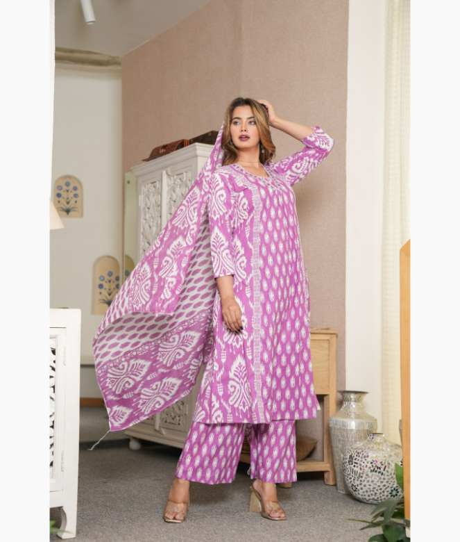 Elevate your ethnic wardrobe with this beautifully stitched A-line cotton purple suit set, a timeless ensemble that blends comfort with refined charm. Crafted from premium quality cotton, the kurta features an A-line silhouette that flatters every body type, offering a graceful flow with every step. Intricate thread work and subtle detailing around the neckline and sleeves add a touch of sophistication without overpowering its minimal elegance.