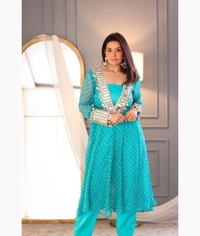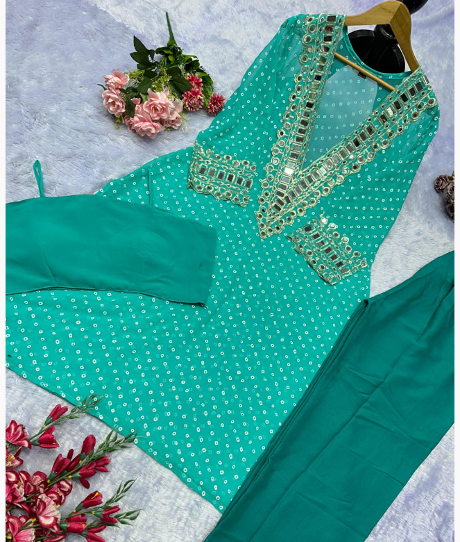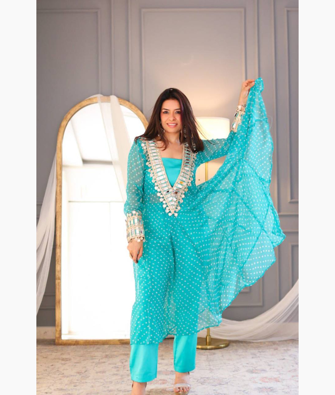 Elevate your ethnic wardrobe with this wonderful stitched georgette blue anarkali-style side-cut Kurti with Pant Collection. this kurti exudes grace and sophistication. The Anarkali silhouette features elegant side cuts that add a contemporary edge to the traditional design, making it perfect for festive occasions, parties, or cultural events. The flattering fit enhances your silhouette while offering all-day comfort and effortless style. Paired with matching pants, this ensemble strikes the perfect balance between tradition and trend.